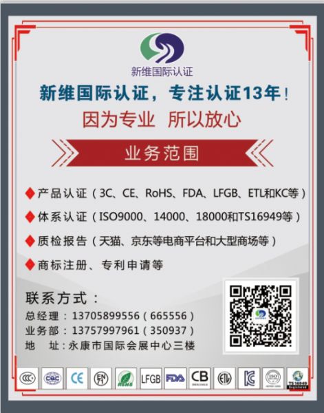 新維國際認(rèn)證位于浙江永康市會展中心六樓,經(jīng)歷十五年風(fēng)風(fēng)雨雨,匯集成本地產(chǎn)品認(rèn)證、體系認(rèn)證和企業(yè)管理咨詢培訓(xùn)較大和較有實力的公司之一,業(yè)務(wù)范圍已經(jīng)擴展到全省,甚至到全國;公司擁有非常專業(yè)的認(rèn)證專員、有實戰(zhàn)經(jīng)驗和專業(yè)的管理培訓(xùn)教練,公司擁有自己的檢測設(shè)備,方便產(chǎn)品預(yù)檢測。我們與德國TUV、瑞士SGS、英國ITS、法國BV、美國UL、中國質(zhì)量認(rèn)證中心、中國中檢集團、中國家用電器研究院、國家玩具檢測中心、浙江立德、浙江方圓、北京中聯(lián)天潤和北京凱新等機構(gòu)建立了親密的合作伙伴關(guān)系。